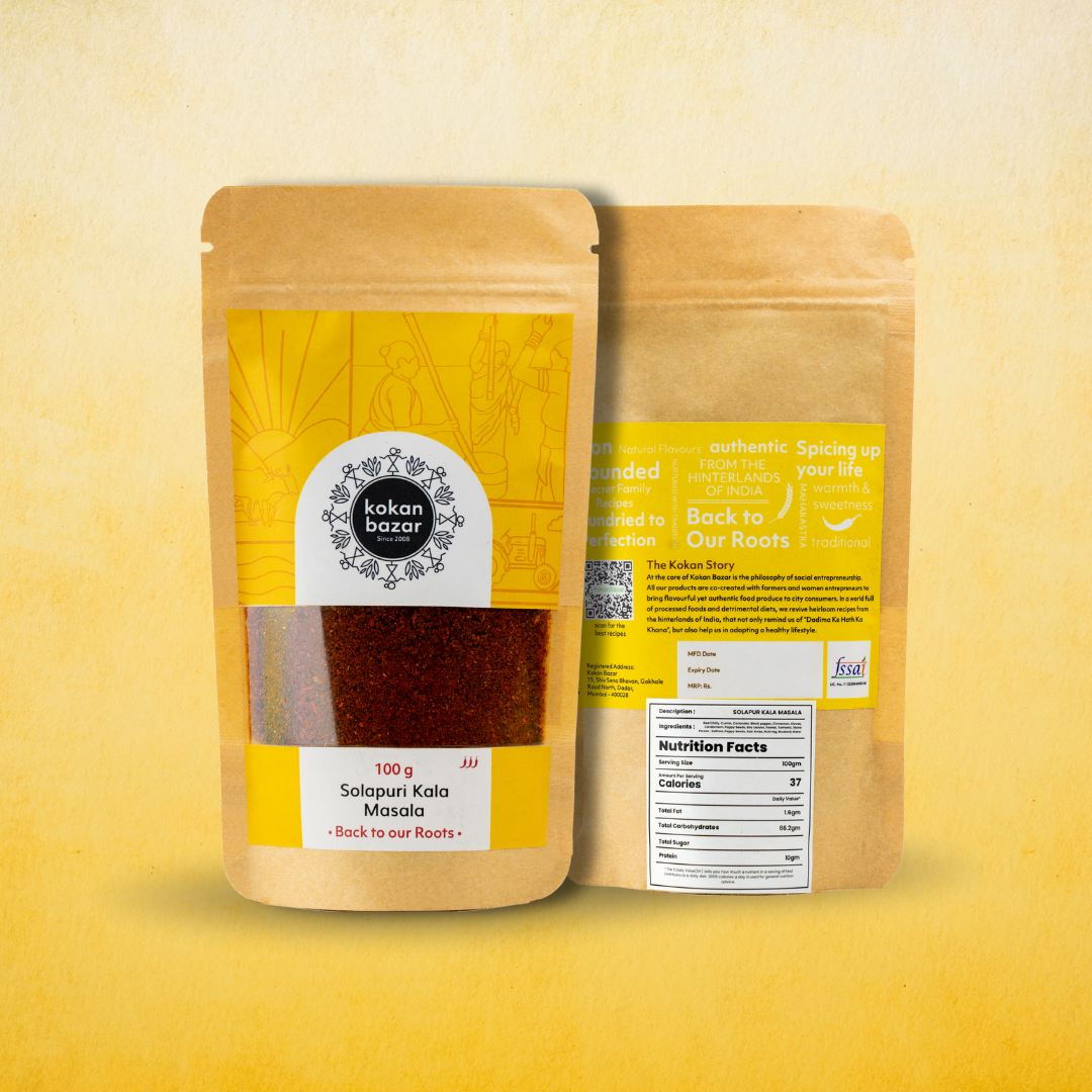 A Legacy of Flavor from Solapur Homes Solapur Kala Masala carries with it the essence of traditional Maharashtrian cooking. This blend comes from a recipe that has been passed down through three generations of homemakers in Solapur, preserving both authenticity and depth of flavor. The masala is made using a rich combination of spices including red chillies, coriander seeds, mustard seeds, cloves, cumin, fennel, dried ginger, stone flower, star anise, poppy seeds, cinnamon, cardamom and hing.Each ingredient is carefully selected, cleaned and prepared to create a masala that is bold yet balanced. The slow process of blending and iron pounding allows the spices to release their natural oils, giving the masala its characteristic depth and slightly roasted profile. This is the kind of masala that transforms a simple dish into something memorable.